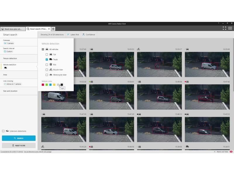 Smart search 2 comes with an intuitive search interface making it possible for any user to quickly search through video material to find persons and vehicles of interest. It is powered by motion object data from the Axis camera, which can be further processed using machine- and deep-learning methods to quickly classify objects such as people, cars, trucks and bicycles. The Smart search 2 function works with most Axis IP cameras and no extra hardware and software is needed.